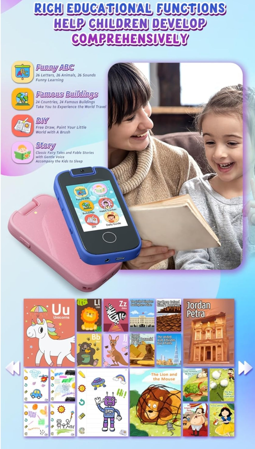 This toy phone includes a calculator, timer, flashlight and multiple apps; Paint, Story Playing, ABC Alphabets and Habits. Helps toddlers and kids to learn alphabets, numbers, develop habits, improve self-discipline and focus.
