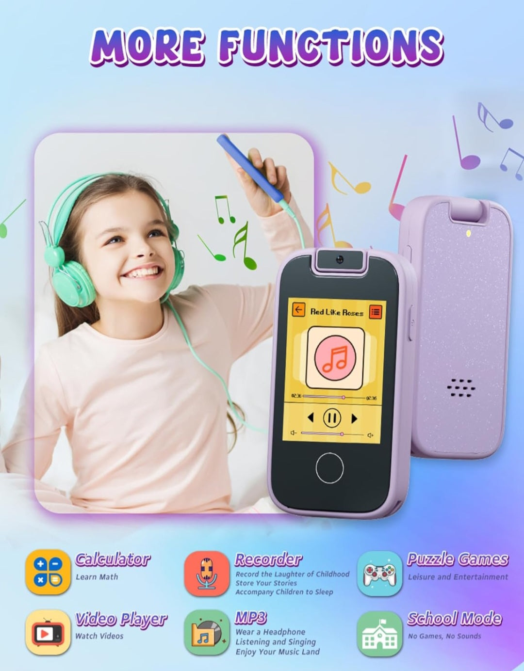 The kids smart phone is equipped with a dual Camera & MP3 Player. It has auto focus, 8.0 Mega Pixels and Video. The device also features a high-quality speaker that supports a 3.5mm headphone jack, so kids can learn and enjoy music.